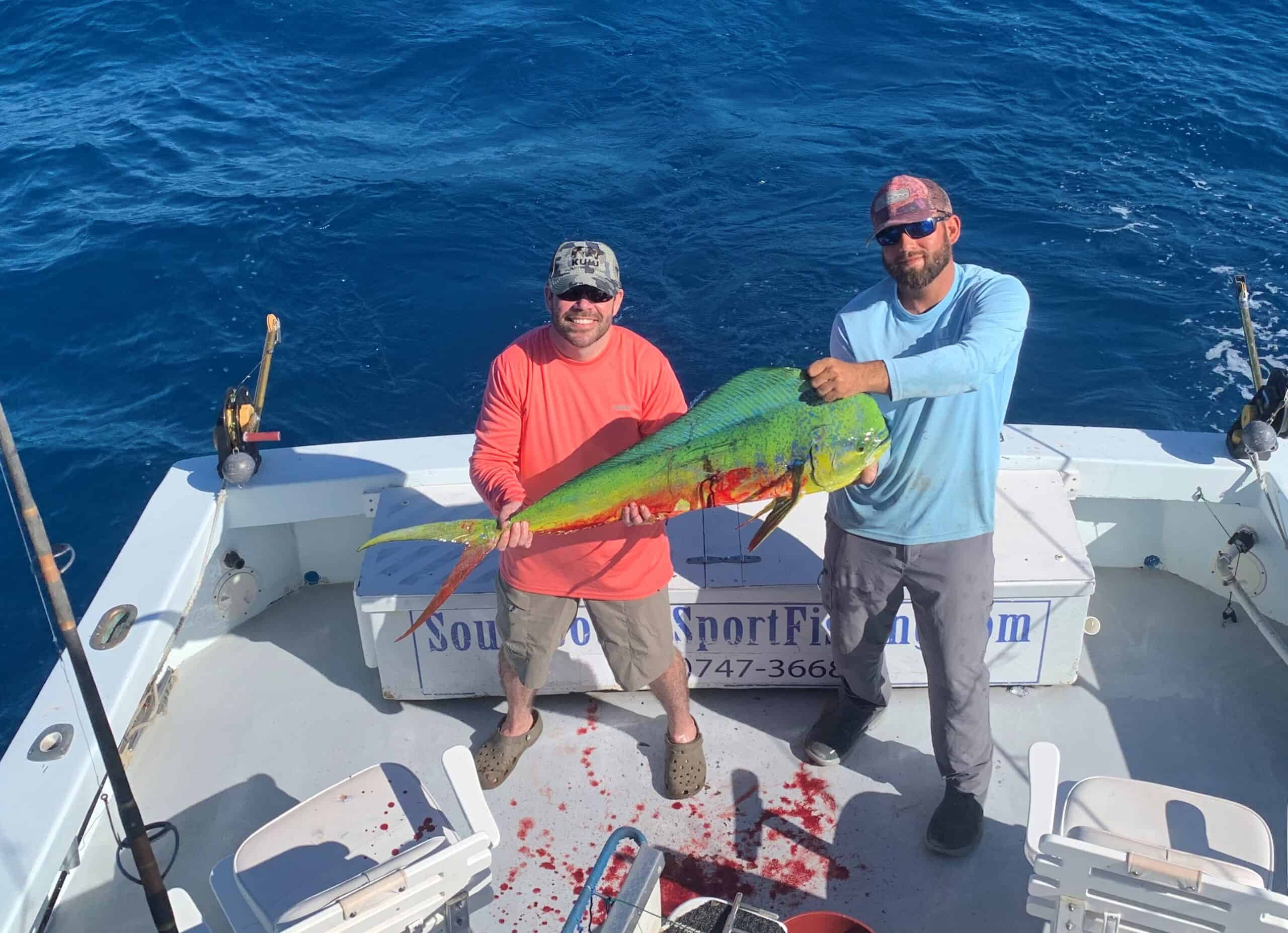 I saw some bait “showering” up ahead of the boat. A bait shower is when a predator attacks a school of bait and they all jump out of the water. it’s cool to see. As the bait showered next to the boat I saw 3 nice-sized Dolphin or Mahi chasing them. My mate quickly threw bait to them and the biggest, A male about 18lbs, inhaled it. My angler did a great job fighting the Mahi on 20lb spinning tackle and it definitely was the fish of the day